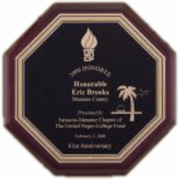 10″x10″ Octagonal Rosewood Piano Finished plaque with black and gold Florentine engraving plate. The same production techniques used to give expensive grand pianos their glossy look is available as a recognition award. Laser engravable solid brass engraving plates. Boxed individually.