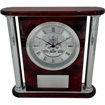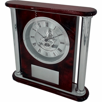 An Elegant Rosewood Piano Finish Clock with Aluminum Accents and room for an Engraving Plate with your customization. This item comes in a nice gift box.