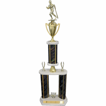 This two-tier trophy comes with your choice of a trophy figure and column color. Also, it comes with your choice of a second figure or year trim as well as a gold plate that is customizable with your engraving.