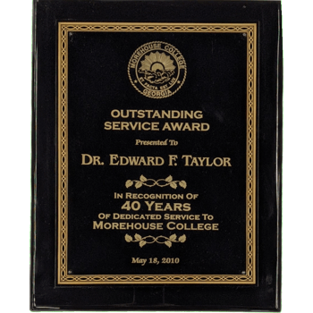 Black stained piano finish plaque with a black brass plate and gold braided design border. The same production techniques used to give expensive grand pianos their glossy look is available as a recognition award. Laser engravable solid brass plates. Individually boxed.