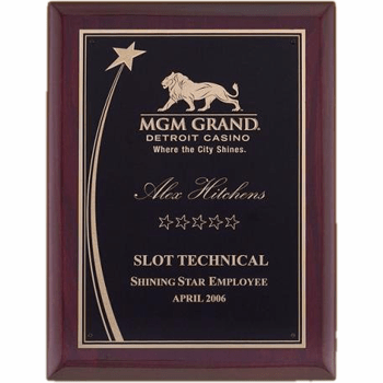 Rosewood Piano Finish plaque surrounded by a gold Florentine shooting star accent engraving plate. The same production techniques used to give expensive grand pianos their glossy look is available as a recognition award. Laser engravable solid brass engraving plates. Boxed individually.