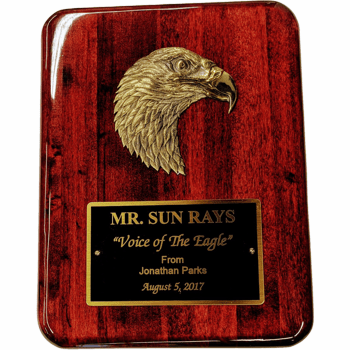 Rosewood piano finish plaque with antique bronze finish finely detailed eagle casting. The same production techniques used to give expensive grand pianos their glossy look is available as a recognition award. Laser engravable plate. Individually boxed.